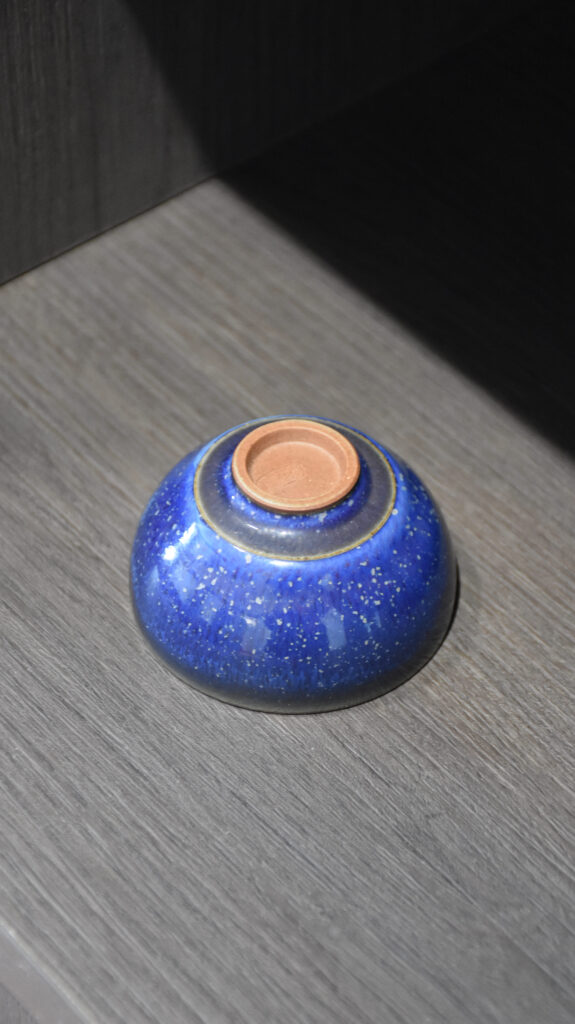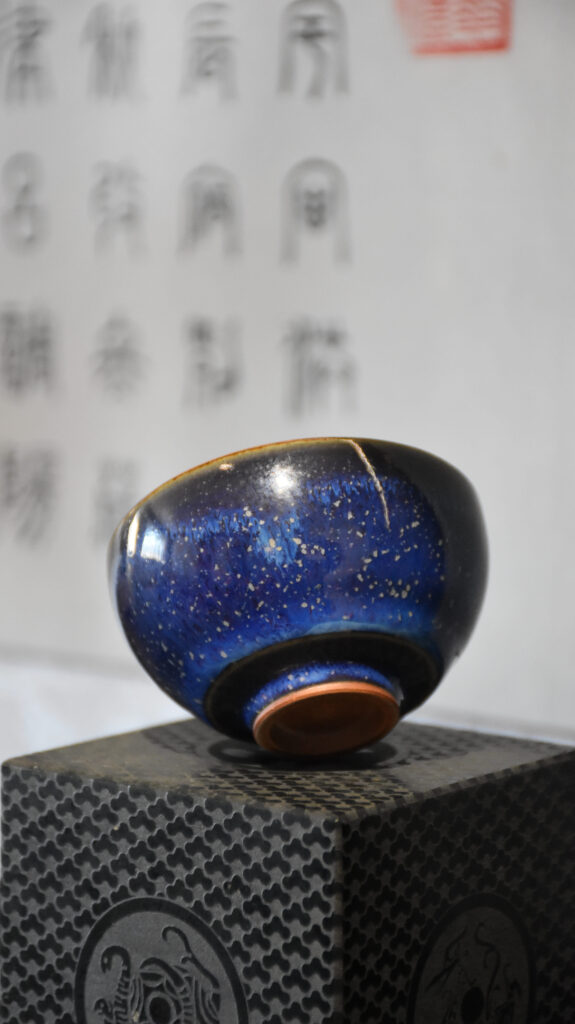 The entire piece is covered in a deep black glaze, with blue glaze smudged on the inner wall and gold specks scattered like shooting stars, combining tranquility and dynamism. Whether for tea tasting, quiet contemplation, or display, it adds elegance to the tabletop, making it a highly aesthetic and ritualistic object for tea connoisseurs.