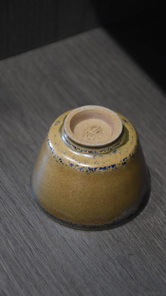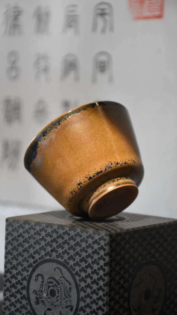 The exterior of this cup is adorned with flowing golden-brown and deep blue iridescent hues, resembling fleeting clouds and shadows, embodying the essence of heaven and earth. The colors are warm and rich, yet vibrant, reflecting the sedimentation of time and the brilliance of craftsmanship.