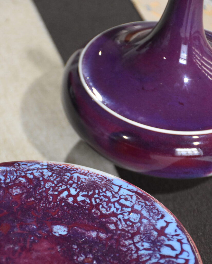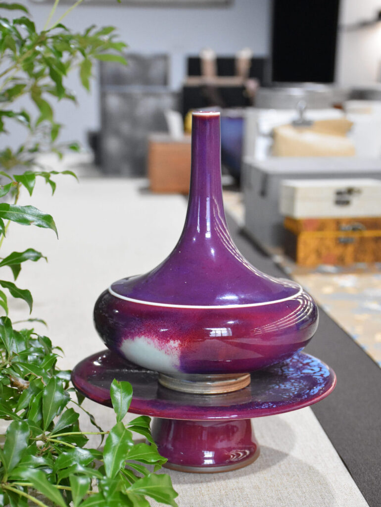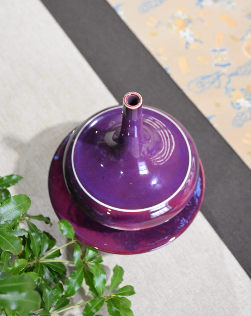 Meticulously wheel-thrown by master artisans, the vessel and dish undergo multiple glazing processes featuring rare purple and sky-blue glazes. The piece is fired at exact high temperatures, resulting in unique crystalline patterns—each work is one-of-a-kind.